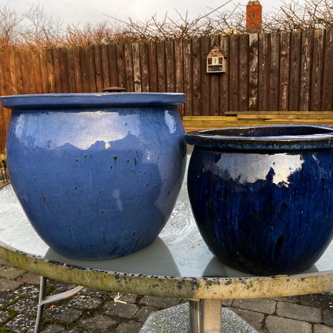 4 havekrukker. 2 med roser og 1 med lyse blomster