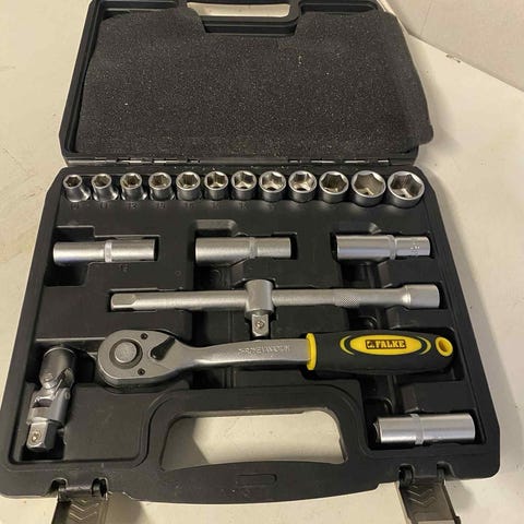 Topnøglesæt i plastkuffert med forskellige toppe, skraldenøgle, forlængere og bits. Sættet leveres samlet i en hård plastkasse med bærehåndtag, som gør det nemt at opbevare og transportere værktøjet. Velegnet til generelle gør‑det‑selv‑ og reparationsopgaver, hvor der er behov for forskellige topstørrelser og bits.