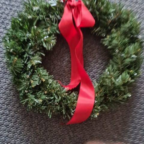 Stor krans bestående af bl.a. birkeris, olivengrene, lærkekogler, gæslingegrene mm.