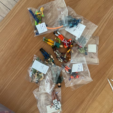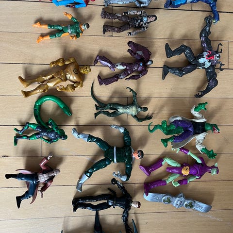 Blandet retro actionfigurer og små figurer i forskellige størrelser og farver. Sættet indeholder flere typer figurer, herunder superhelte-lignende figurer, robotlignende figurer, fantasifigurer og mindre maskotlignende figurer. Figurerne er udført i plast og har forskellige højder og udtryk. Egnet til leg, dekoration eller som supplement til en eksisterende samling af actionfigurer og legetøjsfigurer.