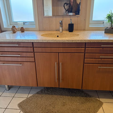 Badeværelsesmøbel med integreret vask og flere skabe/skuffer i creme farve.