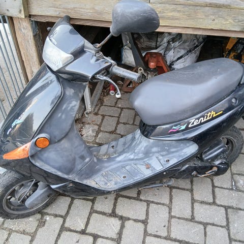 Piaggio Zip scooter i sort. Scooteren fremstår delvist adskilt med flere løse dele, herunder sæde og kåbedele. Velegnet som til reservedele. Dele kan købes løst fra 50kr