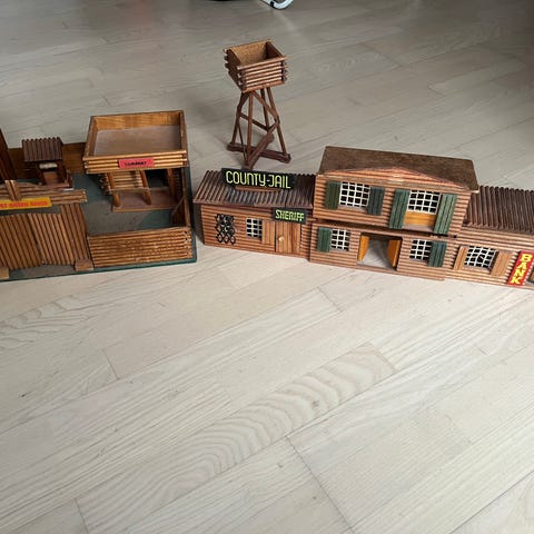 Cowboy huse som ligner bjælkehuse. Saloon med svingdør, Bank, Sheriff bygning,