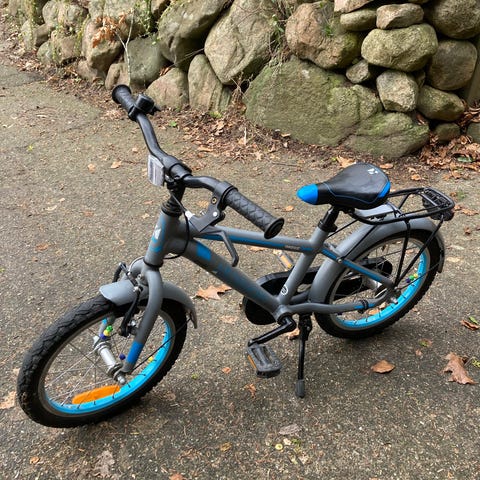 Kildemoes - Bikerz børnecykel med 16" hjul i sort og grøn. Cyklen har bagagebærer, støtteben og kædeskærm. Den er udstyret med reflekser, og cyklen har faste skærme foran og bagpå. Sadel og styr kan justeres i højden, så cyklen kan tilpasses barnets størrelse.