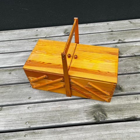 Trækasse / sykasse med hank og låg med blomster stof fra 1970eren. Indvendigt er der et aftageligt indsatsbakke med flere rum til opdeling af indholdet samt et større rum i bunden. Lågets inderside har en stofbeklædt lomme til opbevaring af mindre dele. Velegnet til opbevaring af sytilbehør eller andre småting så som sytråd, knapper, nåle osv. Mål: H 35 cm L 32 cm D 27 cm. Sykassen fremstår i flot stand uden de store brugsspor og kan leveres i Københavnsområdet for en lille mere betaling.