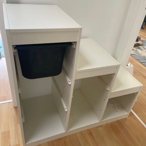 Ikea trofast kommoder med en plade ovenpå. Kommoderne måler hver 1meter og pladen 2,5 meter. Pladen er ikke skruet fast, men lægger bare løst ovenpå (rykker sig ikke), så den er nem at transportere og/eller bruge hver for sig.