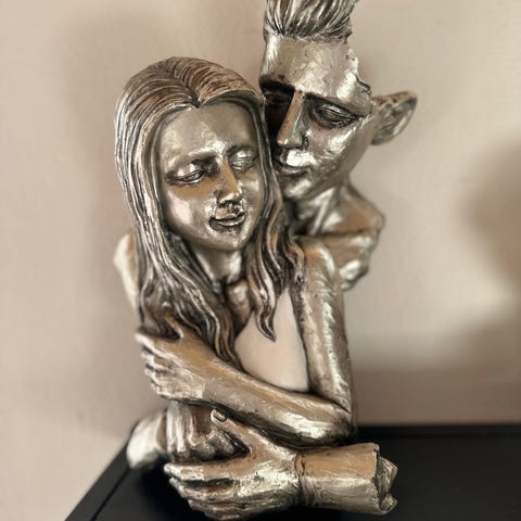 Sælges grundet flytning. Denne fine og detaljerede figur forestiller en knælende kvinde med en lille hund ved sin side. Den har et klassisk, antikt udtryk og vil pynte flot i en vindueskarm, på en reol eller et sidebord.