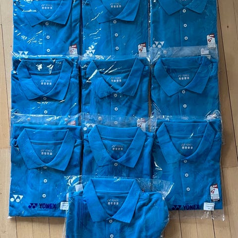 10 stk Yonex 10342EX polo til herre i størrelse XS. Trøjen er gråmelange med diskret mønster og har krave med knaplukning. På brystet ses Yonex-logo, og på ærmet et BWF Aarhus 2020 Denmark Thomas & Uber Cup Finals mærke. Materialet er let og egnet til sport eller fritid. Brystbredden er ca. 50 cm målt på tværs fra armhule til armhule. Flere stk. ses på billederne, alle i original emballage med mærker. 50% polyester 50% bomuld
