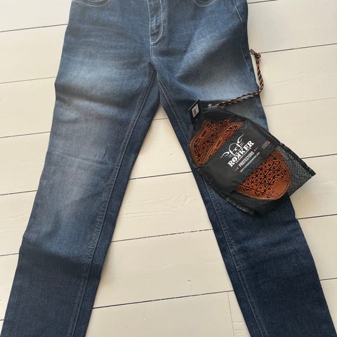 Rokker revolution motorjeans i blå denim. W33 L32. Bukserne er udført i klassisk jeans-look med baglommer og synlige stikninger. De leveres med aftagelige orange beskyttere, som kan placeres i bukserne for ekstra beskyttelse ved kørsel. Original trækasse medfølger.