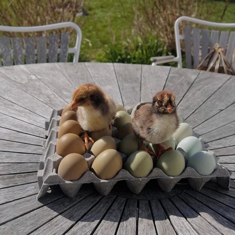 Kyllinger klækket d 16/4- 18/4. Blå læggere klækket d 11/4-12/4 og grønlæggere. Søger skruk høne eller varmelampe.