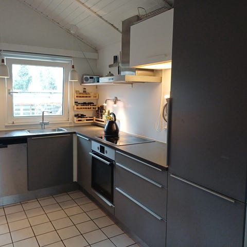 HTH køkken komplet med skabe og bordplade i grå. Køkkenet er udformet som vinkelkøkken med både over- og underskabe samt højskab. Der er integreret stålvask med armatur og glatte fronter uden greb. Bordpladen er i lys, ensfarvet overflade, og væggen har lyse, lodrette fliser som stænkplade. I køkkenet ses indbygget kogeplade og ovn. Indretningen giver både bordplads og opbevaringsplads egnet til almindelig madlavning og daglig brug i hjemmet.