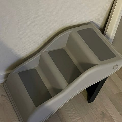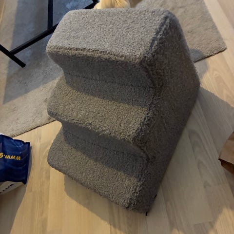 Trappe til kæledyr med 3 trin i lysegrå plys. Trappen er polstret og betrukket med blødt plys, som giver et behageligt underlag for kæledyrets poter. Egnet til at hjælpe mindre eller ældre hunde og katte op i sofa, seng eller andre forhøjede steder i hjemmet. Stabil konstruktion, der kan placeres op ad møbler eller væg efter behov.