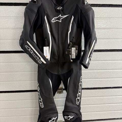 Alpinestars todelt motorcykel læderdragt i sort og hvid. Dragten består af en læderjakke med lynlås foran, integreret rygskjold og forstærkede skuldre og albuer samt matchende læderbukser med knæslidere og forstærkede knæ- og hoftepartier. Sættet er forsynet med Alpinestars-logoer og paneler i tekstil for øget bevægelighed og ventilation. Velegnet til motorcykelkørsel på vej og bane.