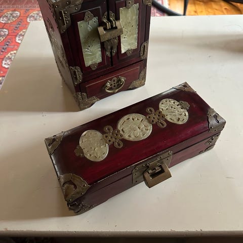 Dette er klassiske kinesiske smykkeskrin, ofte udført i bejdset træ eller rosentræ (rosewood) med dekorative detaljer. Skrinene er et typisk eksempel på kinesisk kunsthåndværk fra det 20. århundrede, ofte dateret til midten eller anden halvdel af århundredet (ca. 1950–1980).