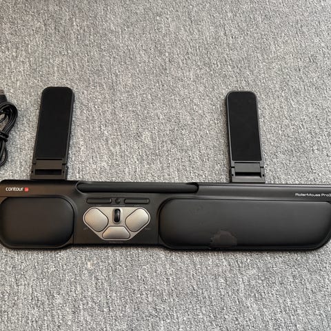 Contour SliderMouse Pro Wireless ergonomisk mus i grå tekstilfront. Trådløs centreret mus til brug foran tastaturet, designet til at reducere belastning i arme og skuldre. Enheden har rulle- og klikfunktion via den lange slider øverst samt dedikerede knapper til venstre/højreklik og navigation. Aftagelig håndledsstøtte med stofbetræk, som kan udskiftes eller rengøres separat. Tilsluttes trådløst til computer og kan anvendes på skrivebord foran almindeligt tastatur.