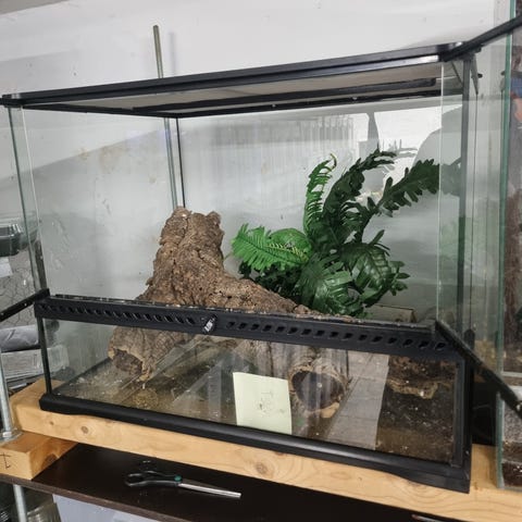 OBS: der mangler en lås i det ene hjørne af terrariet, men det lukker tæt helt fint, se billeder for reference.
