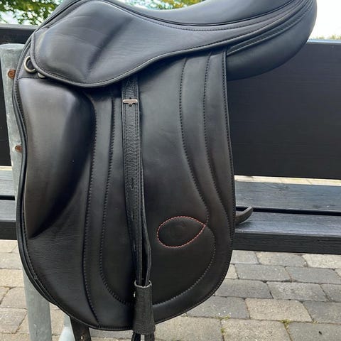 Super flot og velholdt sadel - Greenline er en eksklusiv model med grøn pipelines. Det er en 16 1/2 “ fit 4 ( til den brede hest) . Den er købt i 2017 men kun brugt sammenlagt 5 år. Modtager bud.