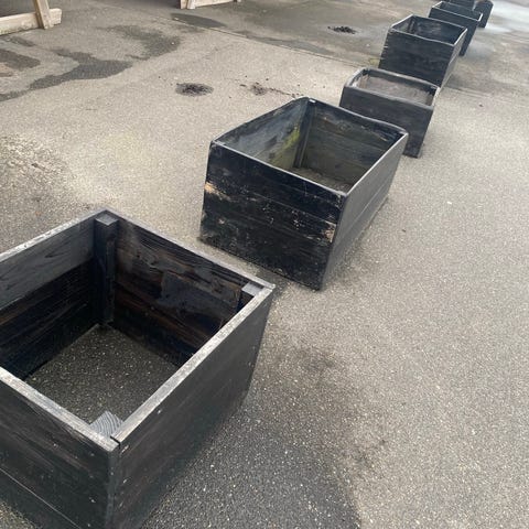 To store runde trætønder / plantekasser til haven. Egnet til udendørs brug i have eller på terrasse til beplantning eller som dekorativ beholder. Tønden har synlige brugsspor og patina efter udendørs anvendelse. Pris pr styk.