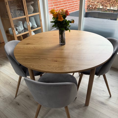 Round dining table ALSTED from JYSK (Ø120 cm) in natural oak color.