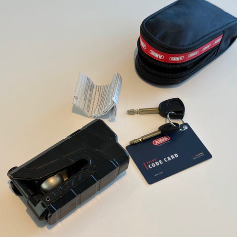Abus skivebremse-lås sæt i gul farve. Sættet omfatter skivebremse-lås, spiralwire med nøglering, bæretaske og nøgler. Egnet til sikring af motorcykel eller scooter ved fastlåsning i skivebremsen. Spiralwiren kan bruges som påmindelse mellem lås og styr for at undgå at køre med låsen monteret. Bæretasken kan fastgøres til køretøjet for opbevaring af låsen under kørsel.