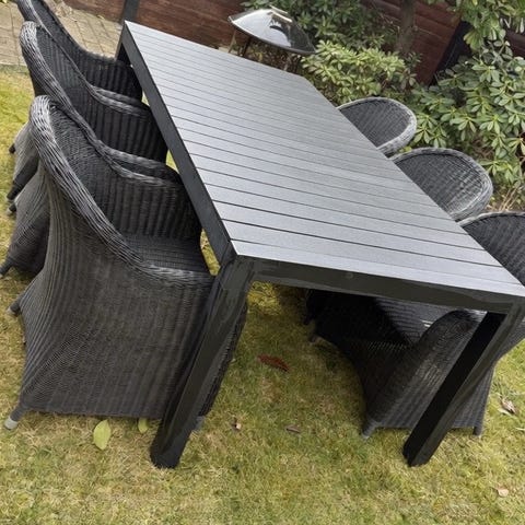 Havebord rektangulært med 8 fletstole grå og sort