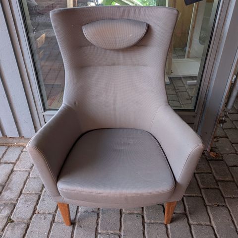 IKEA lænestol med gråt stofbetræk og lyst, bøjet træstel. Stolen har høj ryg og integreret sæde- og rygflade i ét stykke. Armlæn og ben er udført i lyst lamineret træ, og sædet er polstret med fastsyede kanaler i stoffet. Velegnet som læse- eller hvilestol i stue, soveværelse eller kontor. Designet til én person og kan placeres fritstående eller sammen med sofa og andre siddemøbler.