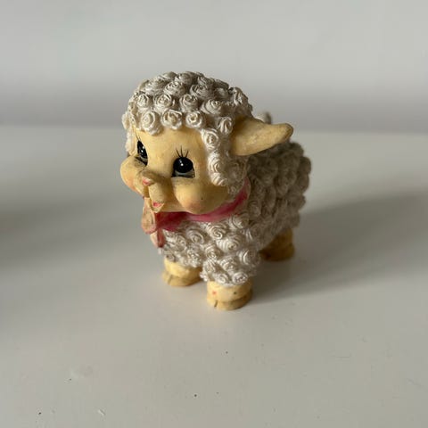 And med sløjfe, pyntefigur, påskefigur, påskedekoration, længde: 18 cm, højde: 10 cm, lidt slidt i malingen på figuren og en lille flænge i keramikken på den ene vinge i toppen, vejer 299 gram.