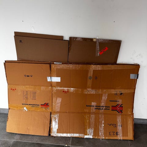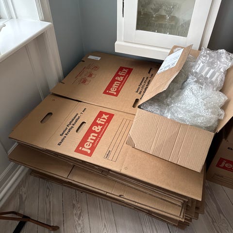8 flyttekasser fra Jem & Fix. Senior flyttekasser i kraftig pap.De 2 har fejlfrie glasindsatser. De er brugt til 1 flytning, og har kun været indendørs, så derfor rene. 10 kr. pr stk, de 2 med glasindsatser 15 kr. pr stk. Kasserne er udstyret med bærehuller i siderne og trykt skrivefelt til indhold. Glasindsatsen består af rumopdeling i pap, som passer ned i kassen og gør den egnet til opbevaring og flytning af glas, flasker eller andre skrøbelige ting. Så her er der 2 rummelige lag.