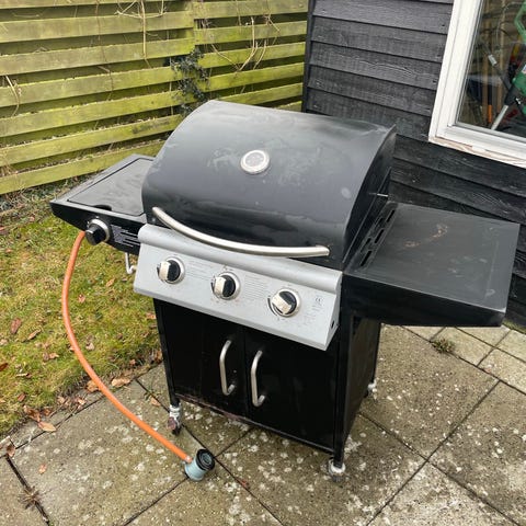 GrillGrill gasgrill med 3 brændere i sort. Grillen har låg med indbygget termometer, to sideborde og frontpanel i metal med tre betjeningsknapper. Grillristene er i metal, og grillen er egnet til brug med gasflaske. Velegnet til udendørs madlavning på altan, terrasse eller have.