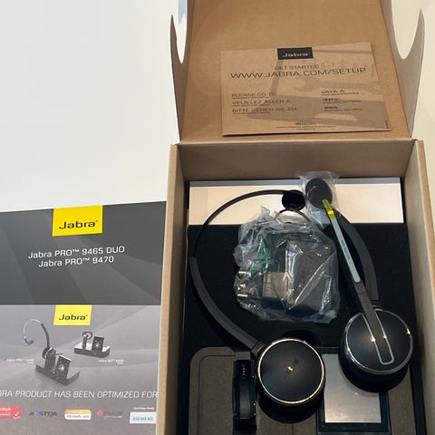 Sælger Jabra Pro 9400 trådløst headset med baseenhed. Perfekt til kontor, hjemmearbejde eller callcenter, hvor man ønsker god lyd og frihed til at bevæge sig uden ledninger.