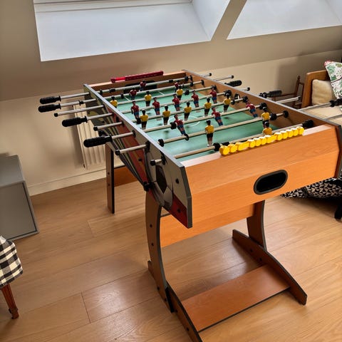 ProPlay bordfodboldbord i sort med grønne og gule spillere. Bordet har flere spillestænger med plastgreb og en spilleflade med fodboldbane-markeringer. Egnet til indendørs brug og velegnet til spil for både børn og voksne. Bordet står på fire ben for stabilitet og har udskæringer i siderne til opsamling af bolde.