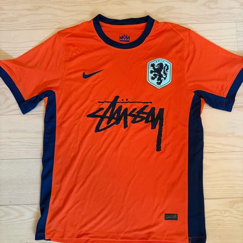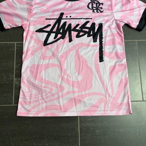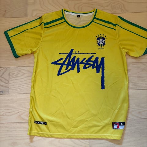 Stüssy fodboldtrøje til herre i størrelse L. Trøjen er overvejende blå med sorte ærmer og sort kant i halsudskæringen. Stor Stüssy-logo-print på fronten samt emblem på brystet. Let og åndbart materiale egnet til fodbold og anden sport eller som casual brugstrøje.
