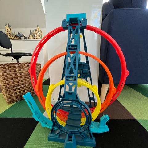 En rigtig fin Hot Wheels Bilbane med to loops og en motor til at skubbe fart i bilerne. Der mangler en kugle og en af de næst korteste vejbaner. Virker fint. Æske og vejledning medfølger samt en bil.