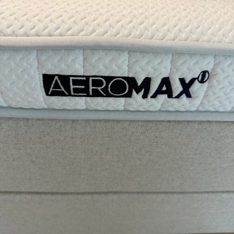 Aeromax topmadras i hvid. Topmadrassen har quiltet overflade med mønster og polstret kant. Designet i Holland ifølge mærkat. Velegnet som ekstra komfortlag oven på en eksisterende madras eller boxmadras.