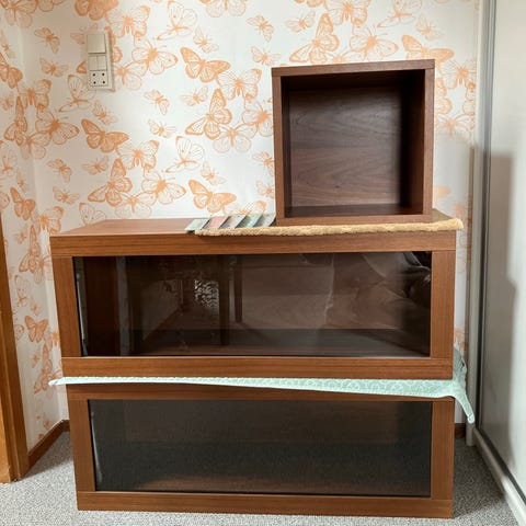 Skovby skab med glaslåger og hylder.