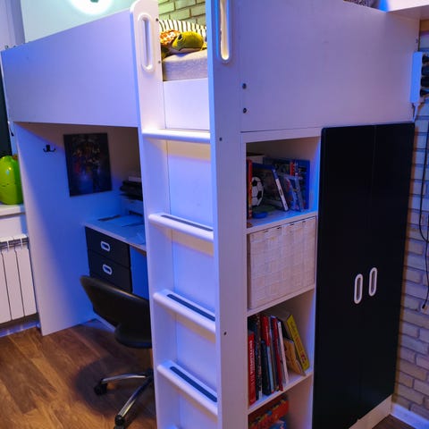 Lundia højseng i hvidt design med stige. Sengen er hævet på ben, så der er god plads under liggefladen til fx skrivebord, opbevaring eller siddeplads. Konstruktionen er i træ med en lige stige monteret på siden. Velegnet til et værelse, hvor man ønsker at udnytte højden i rummet og skabe ekstra gulvplads under sengen.