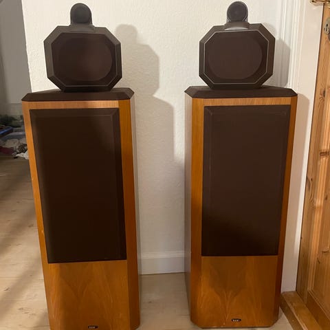 Pæne og relativt velholdte B&W 803 S2. Højttalere med meget fine anmeldelser fra sidste halvdel af 90’erne. Visse brugsspor, men ingen skader på enheder. Spiller ganske fantastisk og sælges i bund og grund kun for at tilfredsstille min evige nysgerrighed. Som vist på foto er der et lille afslag i fineren på bagsiden af den ene højttaler. På tilslutningerne mangler 2 omløbere. Da jeg har anvendt bananstik, har det ikke haft betydning. Kan demonstreres på Ok anlæg.