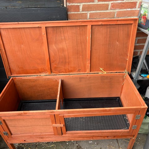 Hjemmebygget stort bur. Isoleret i bunden. Lavet i vedligeholdelsesfrit walltec. Der medfølger en plade der kan dele buret (uden åbning kaniner kan gå igennem). Mål: 130x67