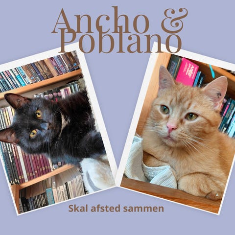 Ancho og Poblano er to unge hankatte, som oprindeligt kom ind som halvvilde katte. De er i dag i pleje hos Nanna i 7140 Stouby og er klar til at rejse.