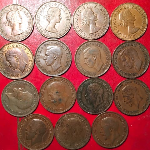 ENGLAND UK 11 x ½ HALF PENNY Alle Forskellige! 5kr/Stk. EDWARD VII 1908, GEORGE V 1913, 1919, 1920, GEORGE VI 1929, 1942, 1943, 1944, 1946, ELIZABETH II 1954, 1957. Eller 45kr for dem alle!!