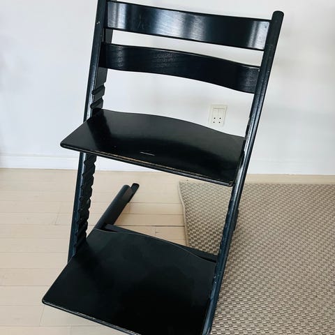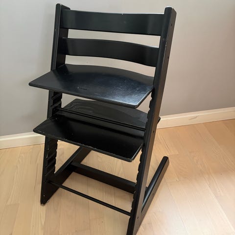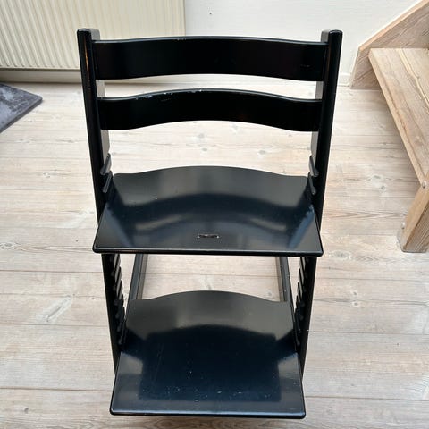 (AI beskrivelse: Stokke Tripp Trapp højstol i sort træ. Klassisk justerbar højstol med regulerbar siddeplade og fodplade, som kan tilpasses barnets højde. Egnet til brug ved spisebord eller som siddeplads til børn i forskellige aldre. Fremstillet i træ med sort overflade.)