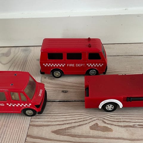 2 stk danske brandbiler 112 i rødt plast, den ene med en stor udtrækkelig stige. Ca. 15 cm lang. Se billederne. Den danske ambulance er en Mercedes ambulance i metal fra mærket wrago, ca. 12 cm lang.