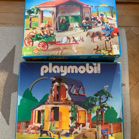 bondegård og hestestald legesæt med flere bygninger, folde og stalde. Sættet indeholder mange Playmobil-figurer i voksen- og børnestørrelse, forskellige husdyr som heste, får, grise, gæs og andre mindre dyr samt tilbehør til landbrug og stald. Der medfølger hegn, fodertrug, redskaber, vogne, grøntsager, halmballer og andre smådele til legemiljøet.