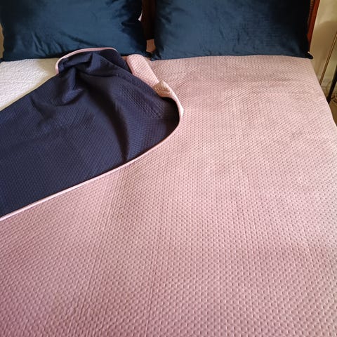 Næsten ubrugt vendbart sengetæppe - 250 x 250 cm og to vendbare puder 90 x 60 cm med lynlås. Stof og fyld er polyester. Afhentes i Værløse