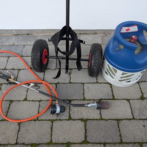 Gasbrænder med tilhørende gasflaske og lang gasslange. Sættet består af en håndholdt brænderstang med ventil og dyse, en fleksibel slange samt en gul gasflaske med ventil og bæregreb. Velegnet til opgaver som ukrudtsbrænding, opvarmning eller lignende udendørs brug, hvor der er behov for åben gasflamme. Brugeren skal sikre korrekt tilslutning og anvende udstyret i overensstemmelse med gældende sikkerhedsregler for gasudstyr.