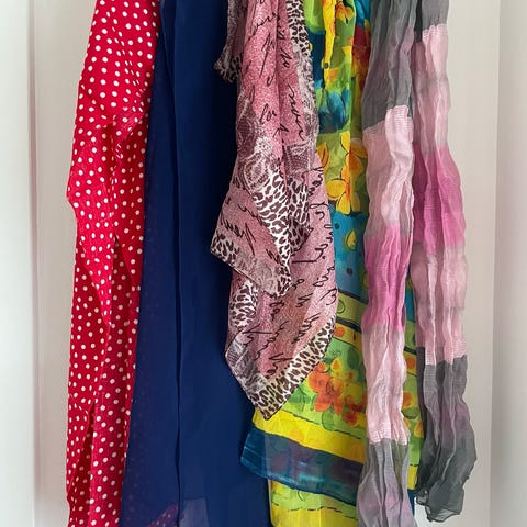 Det mørkeblå og det røde er lidt flossede i et par hjørner. Ellers er tørklæderne fine.