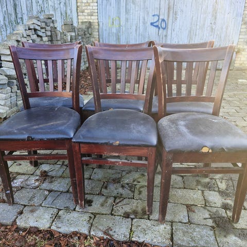 Mørkegrå, meget velholdte, sorte træben. Man sidder godt i dem og de er nemme at holde rene.