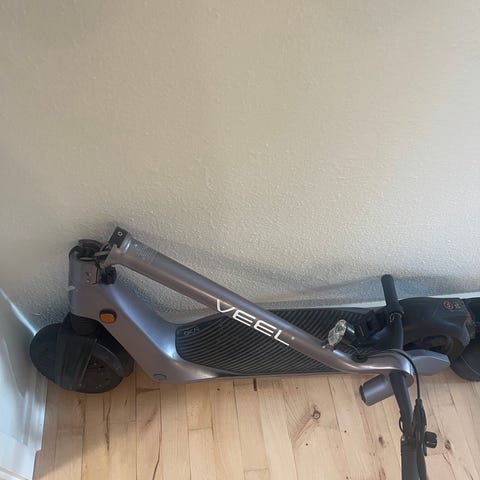 Halfbike løbecykel i hvid farve. Modellen har et stort forhjul og to mindre baghjul, som giver stabilitet og en anderledes kørestilling, hvor man står op og styrer med et højt styr. Velegnet til brug på fast underlag som asfalt og fliser. Designet til motion og transport for én person ad gangen.