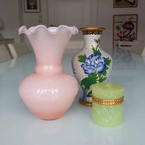 Glas, Opaline glas vase, Vase i opaline glas med blomstermotiv. Til en enkelt blomst eller bare dekoration i sig selv. Højde 18 cm og diameter 8cm. Fin stand.