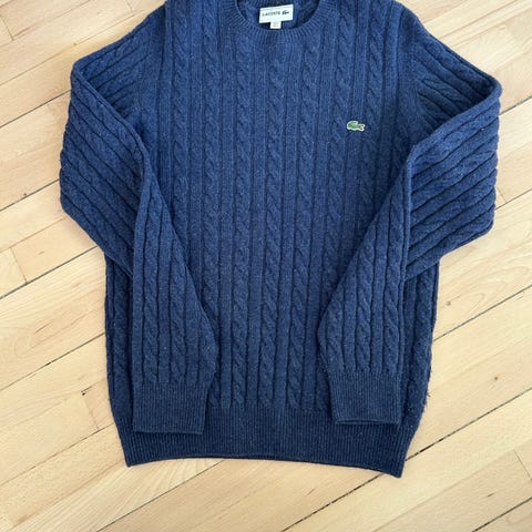 Blå Lacoste strik. Er nok størrelse L, men mærket er der ikke. Købt gennem second-hand så den er brugt. Mix mellem bomuld og polyester. Hentes kun fysisk, skriv for mere info.
